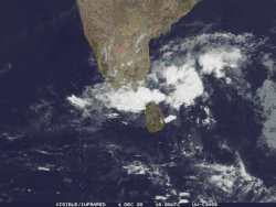 After weakening over Sri Lanka, Burevi exited into the Gulf of Mannar, early on December 3.[11] However, Burevi slowed down quickly as it became stuck in a col between two subtropical ridges on December 4; thus the system stalled just west of Sri Lanka while weakening back down to the equivalent of a tropical depression, due to increasing vertical wind shear.[12] At 06:00 UTC on December 5, Burevi degenerated into an Post-tropical cyclone.[13]