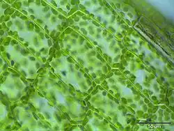 Chloroplasts can be seen travelling around the central vacuole of a cell in Rhizomnium punctatum
