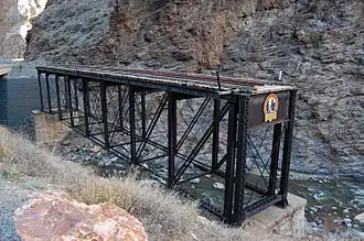 The Pratt Truss-style bridge was constructed in 1895 by the Denver and Rio Grande Railroad, as part of the railroad's narrow gauge passenger and freight route between Gunnison and Montrose in Western Colorado.[2] Crossing the turbulent Cimarron River just upstream from its confluence with the Gunnison River, the trestle replaced a wooden trestle built during the route's construction in 1882. Originally 288 feet (88 m) long, only the central span of it remains today. [3] The last remaining Trestle on the route after the abandonment of the line in the 1950s and the inundation of the Gunnison in the 1960s, the structure was listed on the National Register of Historic Places in 1976.