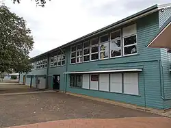 The intermediate wing was a highset timber school building with semi-enclosed stair. From the early 1950s the Department of Public Instruction introduced and developed new standard plans for school buildings, which were similar to the Boulton & Paul buildings but not prefabricated.[50] These buildings were also highset timber-framed structures with the understorey used as covered play space. The principal type was a long and narrow building with a gable roof.[51] A semi-enclosed stair connected the understorey to a north facing verandah running the length of the building, with full height timber verandah posts that extended from ground level to the roof line. Classrooms opened off the verandah and had extensive areas of windows; almost the entirety of the verandah wall and the opposite classroom wall were glazed – with awning (top-hung) windows to the southern elevation, and double-hung sashes to the verandah wall. This type was the most commonly constructed in the 1950s in Queensland.[52][1]