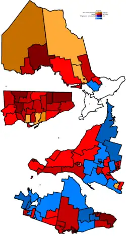 McGuinty's Liberals' 2003 sweep of the province. Liberal seats won appear in shades of red.