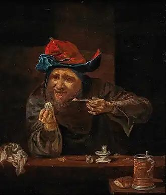 Campo Weyerman stated that Joos van Craesbeeck was Boone's master.[3] Van Craesbeeck was a painter from Antwerp who was a pupil of Adriaen Brouwer and was known for his genre scenes depicting low-life figures as well as scenes of middle-class people. Van Craesbeeck worked in Brussels in the latter part of his career.[4] There is no record of Boone's apprenticeship in the books of the Guilds of Saint Luke of Antwerp or Brussels.[2]