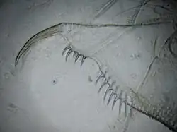 Abdomen with abdominal claw of a female: The two combs with a gap on the margin and the deeply nicked posterior margin are diagnostic of the species.