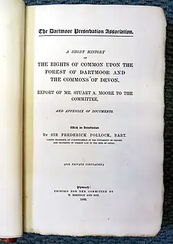 2. ^ a b c Moore, Stuart A. A short history of the rights of common upon the Forest of Dartmoor and the commons of Devon. Dartmoor Preservation Association, Plymouth, 1890. ISBN 0950138649.