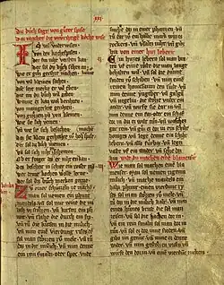 The recipe book was compiled in the late 1340s by Prothonotary Michael de Leone, born around 1300 in Würzburg.[2][1] It appears in several manuscripts, notably in the Würzburger Liederhandschrift, in English the "Würzburg Song Manuscript", part of the Hausbuch des Michael de Leone ("House-Book of Michael de Leone"). The Hausbuch is composed of two volumes, of which only the second is well preserved. In this second volume, a small part (ranging from folios 156r to 165v), ten sheets out of a total of nearly 300, contains the Buoch von guoter Spîse.[3] There is a second manuscript dating from the first half of the 15th century, now held in the Anhaltische Landesbücherei Dessau: MS Georg. 278.2o, ff. 123v to 132v.[4]