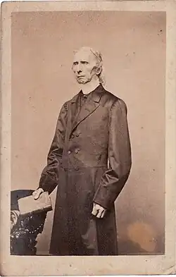 Einhorn was an opponent of the Cleveland Conference of 1855 and its decision that the Talmud had primacy in interpreting the Torah. In this stand, Einhorn stood in contrast to Rabbi Wise's efforts to find language that could accommodate the various strands of Judaism in the United States, arguing that such efforts betrayed the progress of reform.[6] In 1856, he started publishing a German-language monthly magazine, Sinai, devoted to radical Jewish reform, which he also used as a platform for his antislavery pronouncements, which led to the magazine's failure in early 1863.[8] Einhorn remained an opponent of interfaith marriage, arguing in Sinai that such practices were "a nail in the coffin of the small Jewish race", though he opposed the retention of practices such as the wearing of phylacteries, the limitations on activity prohibited on the Sabbath, and kosher dietary laws, all of which he viewed as outmoded. Only those portions of the Torah that derived from a moral foundation were to be retained.[6] He became the acknowledged leader of Reform Judaism in America, and in 1858 he published a revised prayer book, which formed the model for later revisions.[9]