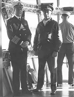 Admiral Sellers (left) in the control cabin of the airship USS Macon alongside the ship's commanding officer, Commander Alger H. Dresel.