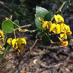 Daviesia buxifolia, commonly known as box-leaf bitter-pea,[2] is a species of flowering plant in the family Fabaceae and is endemic to south-eastern continental Australia. It is an open shrub with egg-shaped to round phyllodes and yellow or yellowish-orange and maroon-brown flowers.