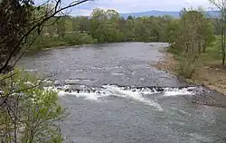 Crockett related an event from his very early childhood in which his brothers almost drowned in the Nolichucky trying to paddle over "a fall in the river, which went slap-right straight down."[7] This may allude to the shoals located along the Nolichucky immediately downstream from the mouth of Big Limestone Creek.[8] Crockett goes on to say that shortly after this incident, his father "removed and settled in the same county, about ten miles above Greenville."[9]