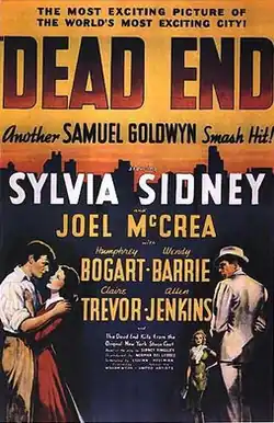 Dead End is a 1937 American crime drama film directed by William Wyler.[1] It is an adaptation of the Sidney Kingsley 1935 Broadway play of the same name. It stars Sylvia Sidney, Joel McCrea, Humphrey Bogart, Wendy Barrie, and Claire Trevor. It was the first film appearance of the acting group known as the Dead End Kids.