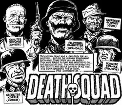 "Death Squad" is a British comic war story published in the weekly anthology Battle from 12 July 1980 to 4 June 1981 by IPC Magazines. Set during World War II, the story follows a Wehrmacht penal military unit spared death sentences in return for service on the Eastern front. It was written by Alan Hebden and drawn by Eric Bradbury.