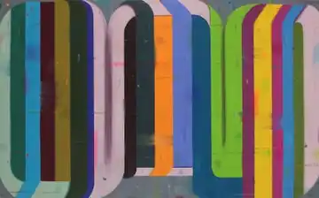In her exhibition, "Today Is Yesterday and Tomorrow" (McKenzie Fine Art, 2023), Zlotsky explored Jewishness and assimilation.[10] The "Diaspora" paintings featured emerging, disappearing and reappearing abstract colored shapes that evoke people moving across time (e.g., Diaspora 3, 2023); other works employed variably legible symbols of Judaica—the number seven, chai ("life") and a striped tallit (prayer shawl); the "Ill-fated ancient symbol" series confronted the swastika, both rendering and revising it into disorder.[10]