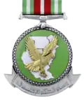 Military Achievement Medal is made of silver and has four tandem surfaces. The first part is a circular disc with a diameter of 55 millimetres of silver plated with gold. The second part is a four-pointed star in oxidised silver on a circle with a diameter of 104 millimetres. The third part is a four-pronged star with a drawing of the gun and the sword in a vertical position of gold-plated silver. The distance between the two large divisions is 102 mm, and the two small ones are 84 mm. The fourth part is a circular disk with a diameter of 35 millimetres, on which the sunbeam appears, and in the centre is the Military Achievement Medal in oxidised silver. The medal hangs from a 55-millimetre-wide, shiny silk ribbon of four colours: two black stripes, each 5 mm wide, on the sides, followed by two white stripes, each 5 mm wide, followed by two green stripes, each 10 mm wide, in the middle of which is a red stripe 10 mm wide, which hangs with a silver clip.[5] |