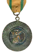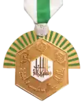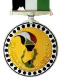 The flag medal consists of a bronze medal plated with gold or silver, 40 millimetres in diameter and five millimetres thick. It is worn on the left side of the chest and consists of three tandem surfaces. The first is a circle with a diameter of 12 millimetres from the white enamel on which the word 'flag' is written in gold in the case of the gold medal. And in the silver colour, in the case of the silver medal, the second is a planet with five long branches and five other short branches, and the third is a circle whose circumference ends with the ends of the short branches. The red, white, and black have a combined width of 10 millimetres.[5] On 7 November 1998, a similar award, Az-Zubair Prize for Innovation and Scientific Excellence was established by President Omar al-Bashir to commemorate General Az-Zubair Mohammed Salih, former Sudan's vice president who died in an aeroplane crash.[25] |