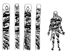 The stylistic "flying deers" on the surface of many deer stones may not just be decorative designs, but may actually represent the body tattoos of the specific individuals being depicted. This hypotheses has been reinforced by the discovery of extensive body tattoos of "flying deers" on the skin of individuals from the Pazyryk culture. Deer stones may just be a schematical but complete representation of the tattooed body of the deceased, together with his tools and weapons.[29]