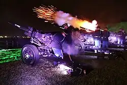 The largest celebration was held on the fabled and elaborate "National Star-Spangled Banner Centennial Celebration" for the one hundredth anniversary for a week in September 1914, which included memorial monuments, statuary and bronze plaques erected, pageants, exhibits, parades, fireworks with reenacting of the shelling of Fort McHenry and the legendary dressing of thousands of school children in red-white-blue colors for a "Living Flag" display.[9] The National Star-Spangled Banner Centennial was however overshadowed by the outbreak of the "Great War" World War I in Europe, the month before after nearly a century of peace on the continent.