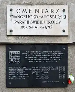 - 54/58 Młynarska Street – another plaque on the wall of the Evangelical cemetery (by the gate) commemorates soldiers of the Pięść Battalion who died in the battles for the Wola cemeteries.