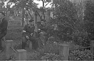 On August 6, from the early hours, the cemeteries and the barricade at the intersection of Żytnia and Młynarska streets were shelled by German tanks, artillery, and the guns of armored train No. 75, moving along the perimeter railway line. The enemy fire soon forced the front-line subunits of the Parasol Battalion to retreat from the intersection to the cemetery grounds. Among those killed was courier Krystyna Wańkowicz (codenamed Anna) – the daughter of Melchior Wańkowicz.[42] During an inspection of forward positions, the commander of the Parasol Battalion, Captain Adam Borys (codenamed Pług), was severely wounded (he was replaced by Second Lieutenant Jeremi).[43] At 6:00 AM, the German police attacked Radosław's southern flank along the entire sector from Młynarska Street to Kercelego Square. Two and a half hours later, a frontal assault by the 608th Guard Regiment on the Calvinist cemetery began. The attack from the south was temporarily halted by the Poles along Żytnia Street. However, on the western sector, the Germans managed to penetrate the Calvinist cemetery. A counterattack by the Parasol Battalion momentarily stopped the enemy's advance there but failed to push the Germans out of the necropolis walls. During the cemetery fighting, the commander of the 2nd Company of Parasol, Officer Cadet Stanisław Jastrzębski (codenamed Kopeć), was seriously wounded. Meanwhile, German artillery fire broke through the wall of the adjacent Evangelical cemetery. Pressured heavily by the enemy, Parasol companies had to retreat deeper into the cemeteries and organize a defense within the maze of graves.[44] With the looming threat of the Germans capturing the Wola artery, the Home Army Main Command, along with the Government Delegation for Poland and the close protection platoon, evacuated from Wola, setting up a new headquarters at the school on Barokowa Street in the Old Town.[45][46] Following them, units of the Paweł Group also moved to the Old Town, and at night, the remnants of the People's Army units.[47] Unarmed soldiers were dismissed from the ranks. These events severely weakened the cohesion of the Polish defense. By 4:00 PM, the Calvinist and Evangelical cemeteries were captured by the Germans, and their defenders were pushed back to Okopowa Street. Threatened with encirclement from the north, the Parasol and Pięść subunits were also forced to withdraw from Młynarska Street and the Gizów colony towards Okopowa Street.[41][48] The enemy was satisfied with these successes and did not continue the assault towards the Jewish cemetery and Okopowa Street.[49]