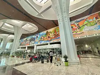 The new terminal initially covered an area of 12,950 m2 (139,400 sq ft), was capable of handling 1,800 passengers during peak hours and about 2 million passengers annually, which now increased to an area of 42,776 m2 (460,440 sq ft), an apron capable of handling 20 Airbus A320 and Boeing 737 type aircraft, and is able to handle 3,240 passengers during peak hours and 4.7 million passengers annually, thereby expanding the capacity of the airport by eightfold.[17] The new terminal building has a concourse, check-in areas, security hold and arrival lounge on the ground floor, security hold at first floor, and various offices on the mezzanine floor.[18]
