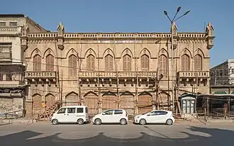 James Strachan was the architect of the project and the building was completed in 1886.[5] The architectural design is Venetian gothic, with Tudor elements on the top floor.[6] Local Gizri sandstone was used in the construction. When the building was completed it had one library and one reading-room on the ground floor, and the main hall on the first floor. The main road facing side has balconies with sculpted balusters. The clock on the top was a gift from Rao Sahib Ramdas Morarji,[7] a local Parsi philanthropist who also donated 1,800 books to the library.[8] The local Khoja community donated another 1,200.[8]