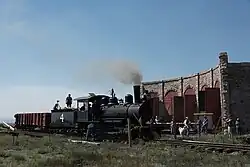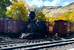 No. 72, a 2-6-0 built in 1884 by Cooke Locomotive Works. #72 was renumbered by the Colorado and Southern Railroad as their #9, and has had a substantial working history: It served as the loco for the "Deadwood Central" excursion trainset which had been assembled for the Chicago Railroad Fair of 1948–49, then went to the Black Hills Central Railroad in 1956,[5] and then to the Georgetown Loop in 1988. As of 2020, #9 is on static display at the Rotary Snowplow Park in Breckenridge, Colorado, having suffered mechanical damage while in service at the Georgetown Loop in 2006.