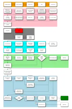 Deployment flowcharts consist of a sequence of activity steps, as well as the interactions between individuals or groups.[1] Each participant in the process is displayed on the map (which is constructed as a matrix) - tasks/activities are then articulated in sequence under the column corresponding to that stakeholder.