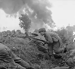 Troops of the 2nd Derbyshire Yeomanry take cover in a ditch during an attack on St Michielsgestel, 24 October 1944.