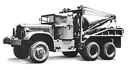 The wrecker had a Holmes twin-boom design with a swinging boom and powered hoist cable on each side. When towing the booms were rotated to the rear, connected at the ends, and worked as one A-frame. When lifting the booms could be separated and rotated 90% forward to the side, an outrigger could be lowered to increase lifting capacity. A power take-off on the transfer case drove a transmission with two winches in the wrecker frame. Controls on both sides of the body allowed each winch to raise or lower independently of the other. The body had low sides on the rear half which tapered to the floor in the front, making clearance for the boom to swing. A brace for the wrecker frame held a spare tire. Welding tanks, an air compressor, cables, block and tackle, chains, tow-bars, and other equipment were carried.[22][23]