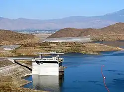The reservoir was initially filled to its capacity of 800,000 acre-feet (990,000,000 m3) in 2003.[4] Water from the Colorado River Aqueduct stopped being used due to the threat of the Quagga mussel, an invasive species that has already contaminated other Southern California lakes served by the aqueduct. In 2009, the lake began being filled with water provided by the Inland Feeder after nearly two years without a source. The water replenished much of what was lost after drought conditions required the MWD to tap into the lake.[11] By March 2016, an extended drought had dropped storage to 299,638 acre-feet (369,598,000 m3).[12]