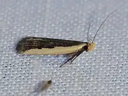 The wingspan is about 12 mm (0.47 in). The costal half of the forewings is creamy white and the dorsal half is dark brown.[3] Adults are on wing from April to October.
