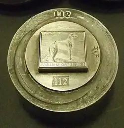 A die for a dog license stamp issued in Ireland, 1865–1928.