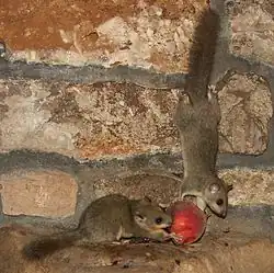 All told, no less than 80 rodent species are known to be taken by tawny owls. While most of these are characteristic prey such as various voles and lemmings and any type of murid rodent from the smallest available mice to the largest available rats, other rodents also taken.[1][34] Black rats (Rattus rattus) were noted to be the main prey for tawny owls in Sicily, where they accounted for 35.3% by number of 351 prey items and 60.2% of the biomass, resulting in a relative high mean prey mass of 79.7 g (2.81 oz) here.[74] Strong biomass contributions were noted of brown rats (Rattus norvegicus) elsewhere such as in Lublin in Poland (wherein they accounted for 41.5% of the biomass) and in Algeria (wherein they accounted for about 20% of the biomass), although many rats taken are on the young side rather than large adults, especially of the large brown species.[35][75][76] The tawny owl's prey spectrum also extends to less accessible prey like squirrels (including ground squirrels), with more or less all the species of Europe and western Asia known to be taken by these owls despite their diurnality, as well as the nocturnal but scarce flying squirrels.[77][34][55][78][79][80] The widespread red squirrel (Sciurus vulgaris), estimated to weigh an average of 150 to 300 g (5.3 to 10.6 oz) when taken, appear to recognize the tawny owl as a serious threat, with ones exposed to recordings of their calls recorded to interrupt feedings, engage in rapid movements and scold harshly.[81][35][53][82] Hamsters may too be taken despite favoring and occurring in more open habitats than those usually hunted by tawny owls.[83][84][85][86] In the southerly parts of the range, as they've acclimated to semi-desert, tawny owls can sometimes partially off of quite different murid rodents like jirds and gerbils as well as the non-murid blind mole rats.[34][86][87][88] Rodent prey may range up to the size of probable juveniles of the non-native nutria (Myocastor coypus).[89]