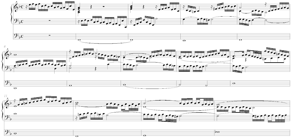 Example 1: This is the introduction from Prelude in F major, BuxWV 145. The motivic interaction seen here, in which a short motif is passing from one voice to another, sometimes sounding in two voices simultaneously, was frequently employed by Buxtehude in his preludes, frequently expanded to four voices with heavy use of pedal.