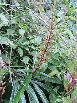 Digitalis isabelliana is a broadleaf evergreen perennial shrub, growing up to 1.5 m (4 ft 11 in) in height, with a much-branched woody base. The leaves are broadly ovate, dark green, glabrous, and with a serrated margin. The flowers are russet, orange or terracotta in colour, with long, beak-shaped hoods, and grow in long spikes.[4][5]