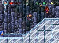 While the majority of the game remains unchanged from one region release to another, a few graphic and gameplay changes exist between the English and original Japanese versions of the game. The cavewomen enemy character "Cindy" was originally designed as a large-busted woman whose character sprite was altered for the North American release due to Nintendo of America's policy against overly-sexual depictions of women on their consoles.[11] The Japanese version also includes the option to select "Normal" or "Hard" difficulty settings at the beginning of the game. While the Hard setting represents the default play mode on the English version, the Normal setting grants the player five health points instead of three, as well as unlimited continues.[11]