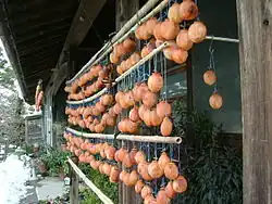 In Korea, it is usually eaten as a dessert or when there are guests at home. The persimmon is cut into sections and the skin and core is usually removed. Persimmons are eaten dry during the winter, and they are very popular amongst children. In autumn, families and farmers from the rural areas collect persimmons and hang them to dry. Dried persimmon is popular sweets in Korea. Powdered sugar is sometimes added to enhance the sweetness.