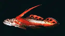 Discordipinna griessingeri is a small, brightly colored, marine neritic fish in the family Gobiidae that is commonly called the spikefin goby or flaming prawn goby.[1] Occasionally it is mislabeled as "Stonogobiops griessingeri" which is a binomial species name that does not formally exist. The spikefin goby has a wide distribution across reefs throughout the western tropical Pacific, Pacific Islands such as Hawai'i or Polynesia, the Indian Ocean, and the Red Sea.[2][3] It is also occasionally collected and traded as an exotic aquarium fish in multiple countries.[3]
