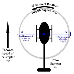 Now imagine the helicopter in forward flight, at v meters per second. The speed of the blade-tip at point A in the diagram relative to the air is the sum of the blade-tip speed and the helicopter forward-flight speed: rω+v. But the speed of the blade-tip at point B, relative to the air, is the difference of its rotational speed and the forward-flight speed: rω-v.