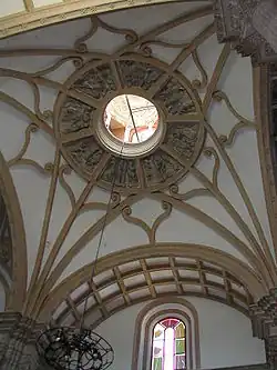 Over the transept the vault with tracery is decorated in its upper part by coffers, containing scenes of the Passion, and is open to the outside through a slender roof lantern, supported at its corners by four typically Vandelvirian semi-pillars, highlighting the detail of the three-angled corners as an elegant transition to the ceiling tracery. The lantern supports its dome on six free columns crowned with Tuscan capitals. To raise the height, there are bases decorated with various motifs: mirrors, the coat of arms of the Dominican Order and the arms of Messía and Fonseca.