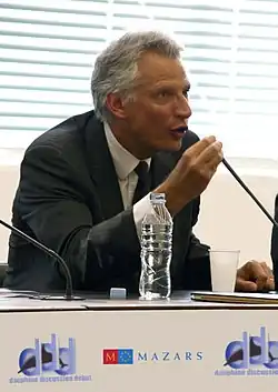 In 2010, Villepin quit the UMP and set up a new party, République Solidaire, with the aim of running for president in the 2012 elections.[30] He advocated the rewithdrawal of France from the NATO integrated military command.[31] However, he failed to secure the 500 necessary "parrainages" endorsements from elected officials in the preliminaries to the presidential race, and his candidacy did not proceed.[32]
