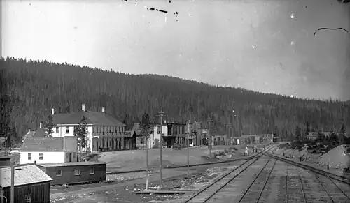 By March 1899, the station refreshments facilities were closed, the CP boarding house and icehouse moved, the butcher closed, and the school enrolments dropped from 60 to 30.[65] Despite the losses suffered by residents as a result of the CP move,[66] the only compensation provided by CP was free transportation to set up elsewhere. Forrest House hotel was demolished at this time.[67] Dismantled and moved to Golden were the courthouse that September[68] and the jail in November.[69]