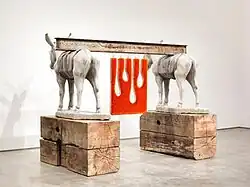 Lot 010212 (the double hazard), oil on linen with wood panel support, concrete statuary, wood timbers, acrylic paint on burlap, gaffers tape, wire, steel I beam, hardware (69 x 87 x 57 inches)