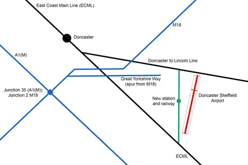 The airport was opened up to civilian traffic in 1996 when the Royal Air Force left.[2] Reopening the former railway station at Finningley on the Doncaster–Lincoln line was mooted before DSA proposed a new build railway in late 2016, with formal talks with Network Rail being held in 2017.[3] The plan would be to build a new section of railway looping southwards off the Doncaster–Lincoln Line, heading through the airport estate and joining up with the East Coast Main Line south of the airfield boundary. The line would stretch for 4.5 miles (7.2 km)[4] but would require 7 miles (11 km) of new line with junctions at both ends.[5] Initial costings placed the scheme at £100 million, but by 2018, a more detailed estimate was given as £170 million for the station and £280 million for all the works including "unexpected circumstances".[6] By 2020, the estimated cost was £300 million as a flyover junction would be needed at the southern end of the spur at Bawtry.[7]