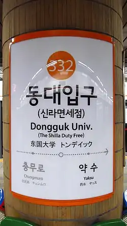 Dongguk University Station (Korean동대입구역) is a station on the Seoul Subway Line 3 located in Jangchung-dong 2-ga, Jung District, Seoul, South Korea. As its name indicates, it serves the nearby Dongguk University. In addition, Jangchung Gymnasium, an indoor sports arena most famous for hosting ssireum (Korean wrestling) matches on holidays, is outside Exit 5. It is also the closest station to Shilla Hotel.[2]