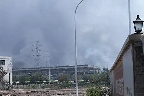 The station was severely damaged on 12 August 2015 when a series of explosions occurred at the nearby Port of Tianjin. The roof of the station collapsed. As a result of the damage as well as the ongoing situation at the blast site, the station was closed for repairs from 13 August 2015[2] and reopened on 31 December 2016.