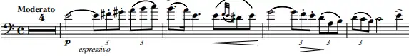 The second movement is lyrical and resembles an extended aria.[2] The movement is characterized by dramatic, unexpected dynamic changes and the incorporation of operatic characteristics such as the Italian lament and bel canto styles.[1]