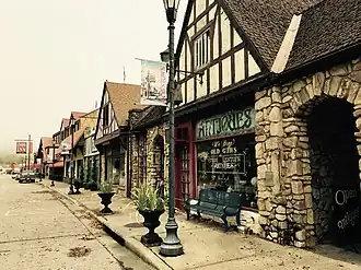 Downing Street Historic District, also known as The English Village, is a national historic district located at Hollister, Taney County, Missouri. The district encompasses 12 contributing buildings built between 1909 and the 1920s as part of a planned village in the Tudor Revival style. The buildings feature walls made of stone and stucco in a light beige color, with decorative boards painted a dark brown. Notable buildings include the U.S. Post Office - Gwinn Ceramics, Christian Science Society, Ye Old English Inn, and Hollister City Hall (formerly Missouri Pacific Railroad Depot, 1910).[2]