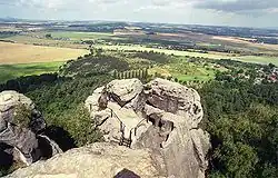 Drábské světničky is a ruin of a 13th-century rock castle in the Czech Republic. It is located about 4 kilometres (2.5 mi) northeast of Mnichovo Hradiště on the ragged edge of a sandstone cliff high above surrounding landscape. The castle covers a group of seven sandstone rocks, connected with wooden bridges. It has been abandoned since the Hussite wars in the 15th century.
