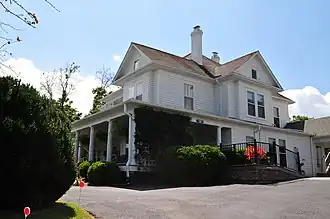 Dr. Virgil Cox House is a historic home located at Galax, Virginia, owned by Virgil J. Cox. It was built about 1913, and is a large 2+12-story frame dwelling with Queen Anne and Colonial Revival style design elements. It has a complex exterior presentation, complex roof plan, and an equally complex floor plan. The house is sheathed in German siding and features irregular, front-gable projections on the facade and north side; a projection with a polygonal bay on the southwest corner, a gable-roof dormer on the facade; and a small, upper balcony on the facade with attenuated Tuscan columns and pilasters. Also on the property are a contributing boxwood garden and outbuilding.[3]
