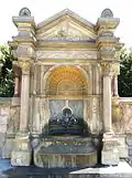 The first fountain, so called, stands upon the side of the road on the west side of the Wissahickon … It is claimed that this is the first drinking fountain erected in the county of Philadelphia outside of the Fairmount Water-Works. A clear, cold, mountain spring is carried by a spout, covered with a lion's head, from a niche in a granite front, with pilasters and pediment into a marble basin. The construction bears the date 1854 … Upon a slab above the niche are cut the words "Pro bono publico"; beneath the basin these, "Esto perpetua".[3]
